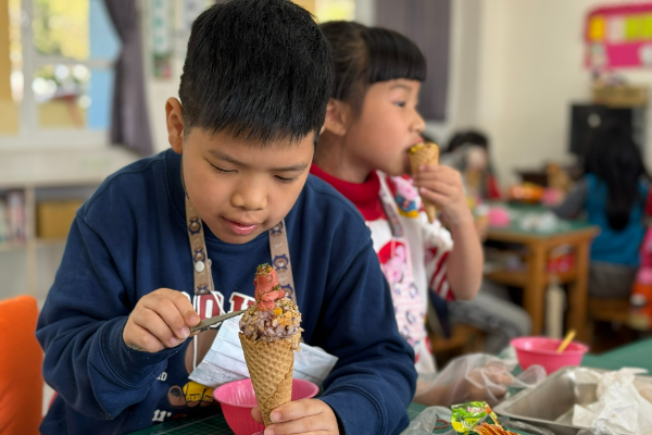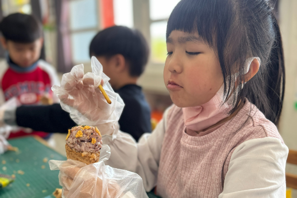 熱騰騰的白米飯捧在手心,孩子們把飯糰捏成圓滾滾的形狀,再發揮創意大變身——有人把飯糰裝進甜筒裡,變成「米飯冰淇淋」;有人再撒上最愛的多利多滋起司餅乾,增加酥脆口感;還有人插上可愛的小章魚熱狗,讓飯糰瞬間變身派對主角。